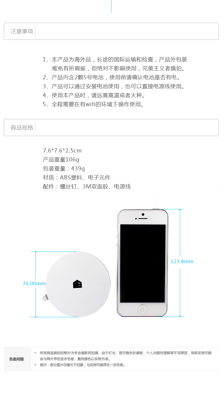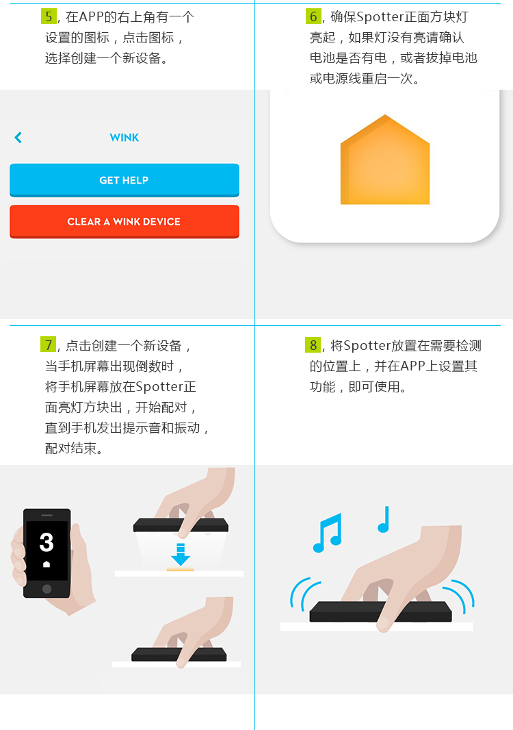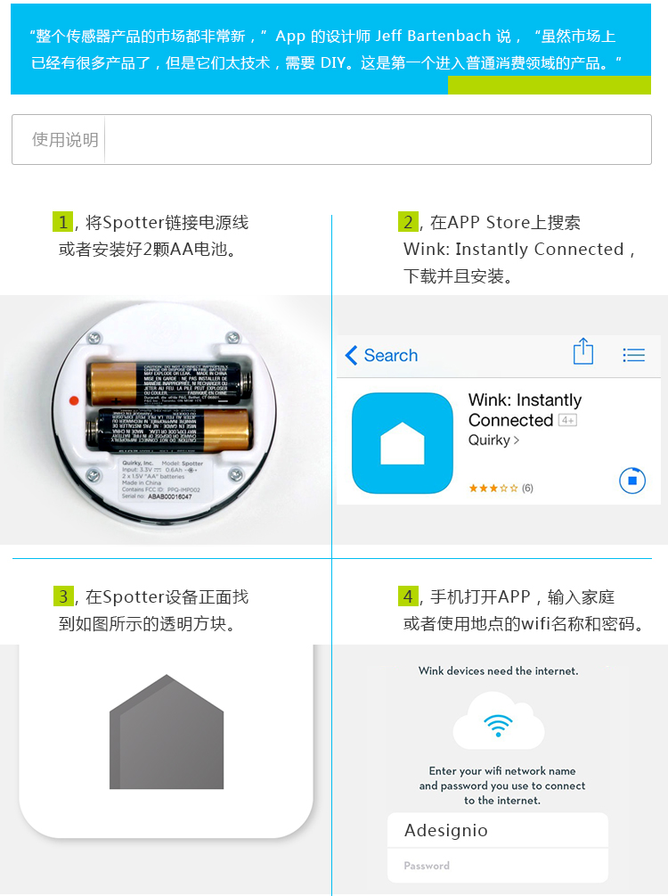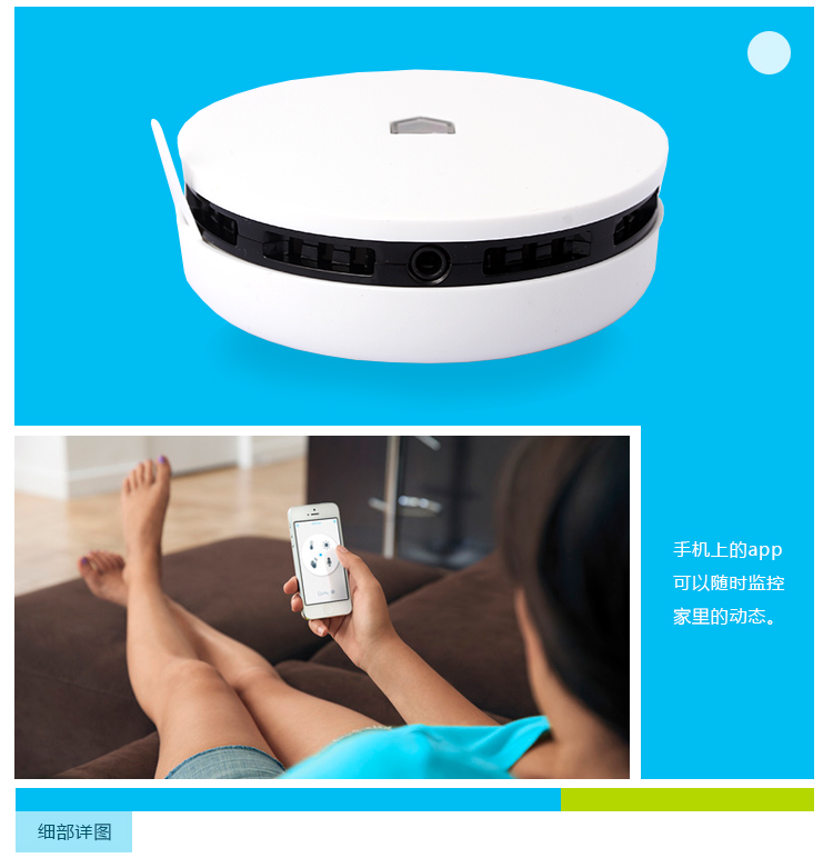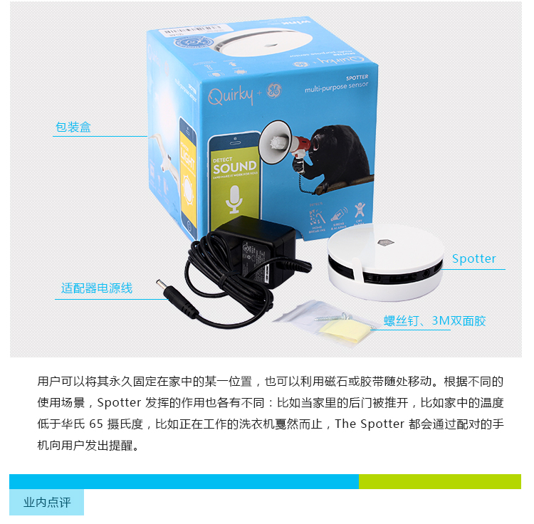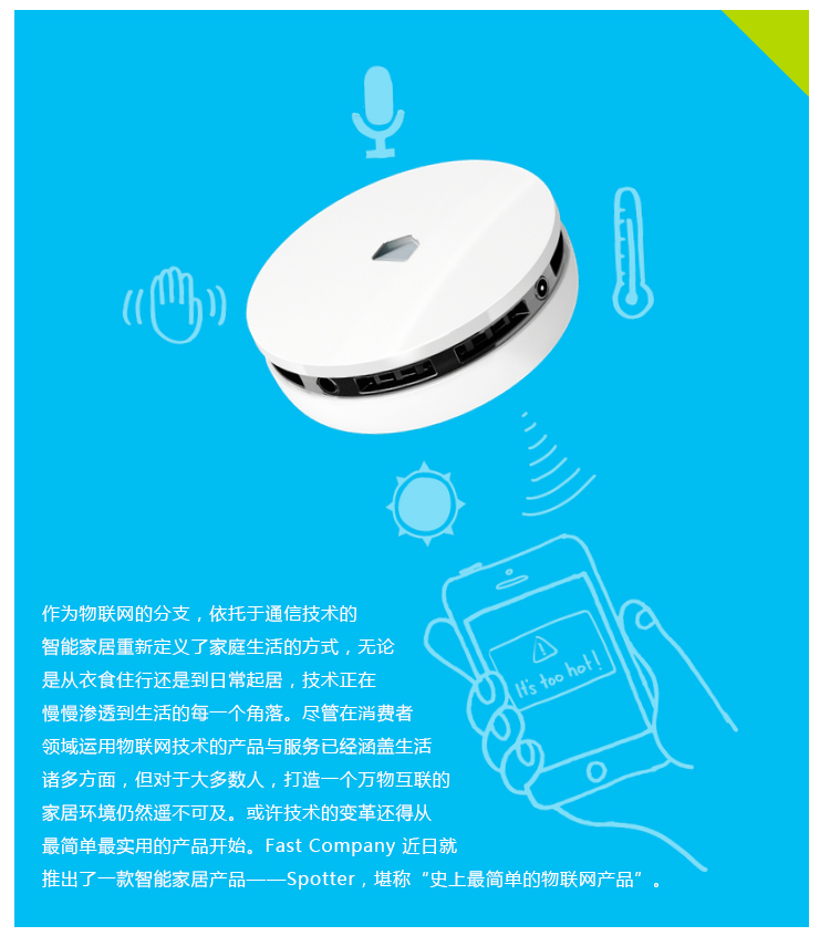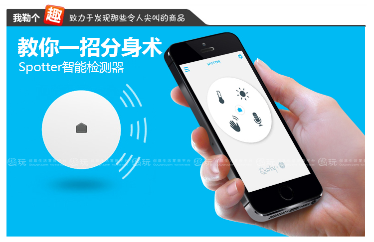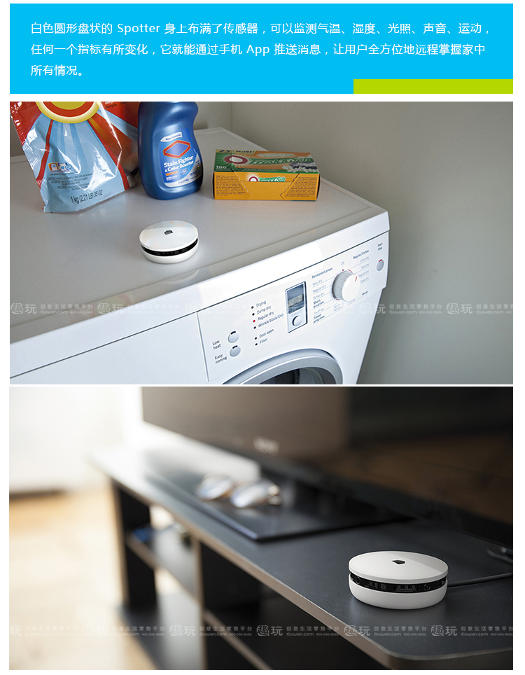 1.白色圆形盘状的 Spotter 身上布满了传感器,可以监测气温、湿度、光照、声音、运动,任何一个指标有所变化,它就能通过手机 App 推送消息,让用户全方位地远程掌握家中一举一动。 2.用户可以将其永久固定在家中的某一位置,也可以利用磁石或胶带随处移动。根据不同的使用场景,Spotter 发挥的作用也各有不同:比如当家里的后门被推开,比如家中的温度低于华氏 65 摄氏度,比如正在工作的洗衣机戛然而止,The Spotter 都会通过配对的手机向用户发出提醒。