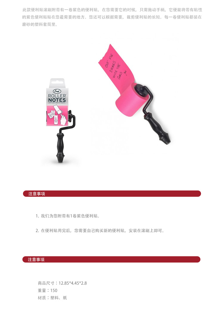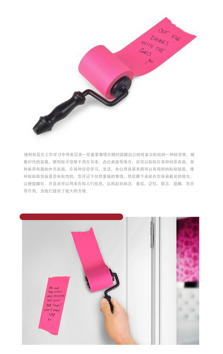 便利贴我们时常都会使用到,无论是在家里、学校,还是办公室。但或许您觉得它们看上去很无聊。那么为什么不尝试着装扮一下您的便利贴呢,我向您推荐这款滚刷便利贴,它带有轮子、可以转动着将便利贴贴满您的房间或者办公室。它不是传统的方方正正的便利贴,这个独一无二的小玩意可以在您需要的地方“刷绘”出一张张便利贴,它就像是一个绘画刷,但是只会产生出带有粘性的便利贴。