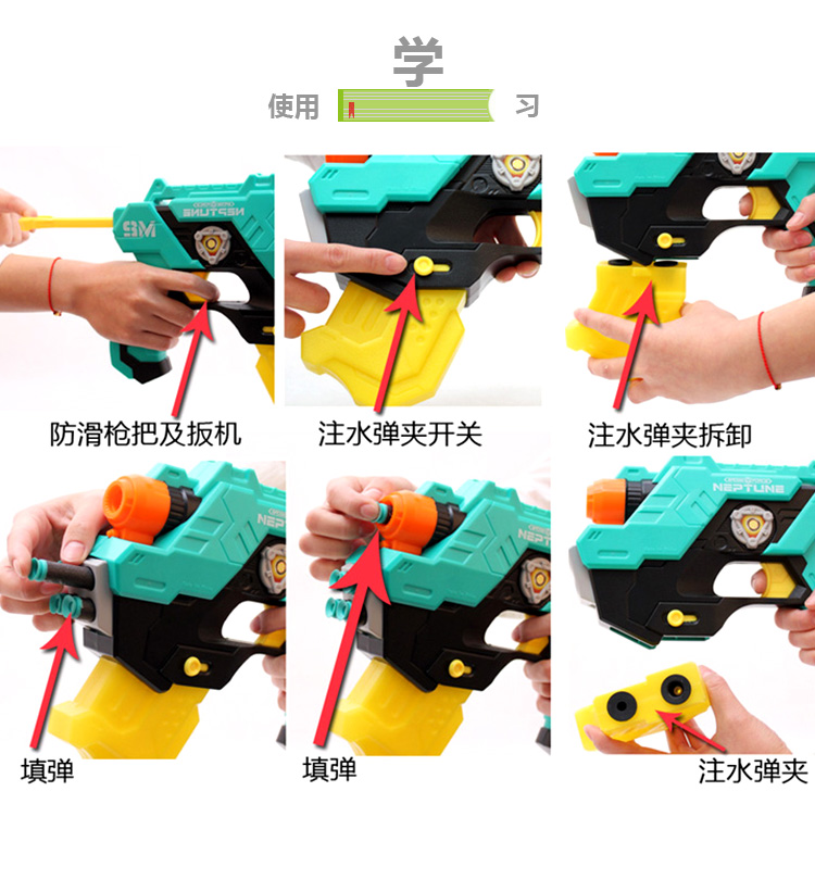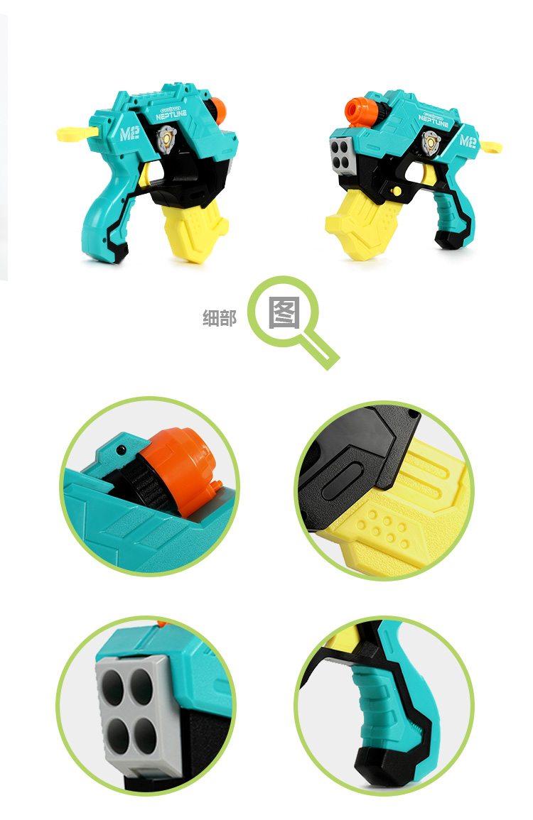 1.造型美观,由香港知名汽车外形设计公司设计,外形生动,色彩鲜艳;2.产品均采用最优质原生塑胶原料,安全环保,无任何异味;3.出色的外形设计与颜色搭配,开启小朋友对颜色与外形的刺激探求;4.安全泡沫子弹,不伤人,射出来的子弹可以吸附在玻璃上,适合一家人亲子游戏;5.半自动激发、培养小朋友的动手能力与反应能力;6.自主设计,3C认证,外观专利。