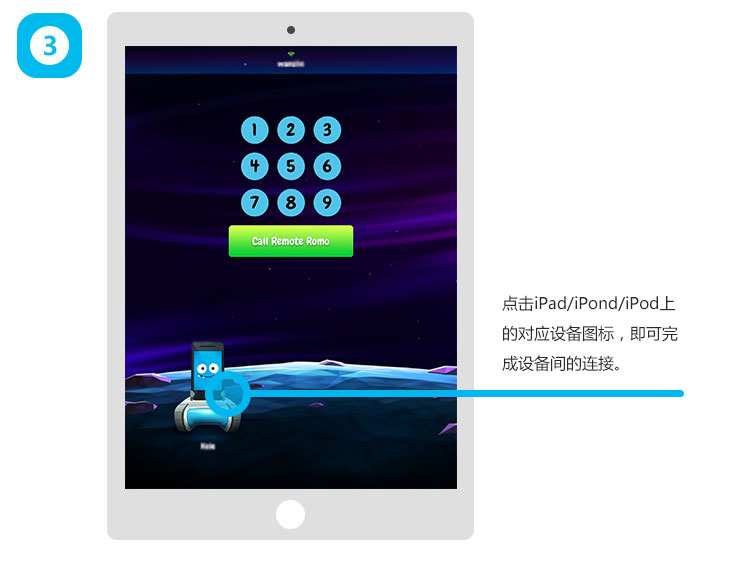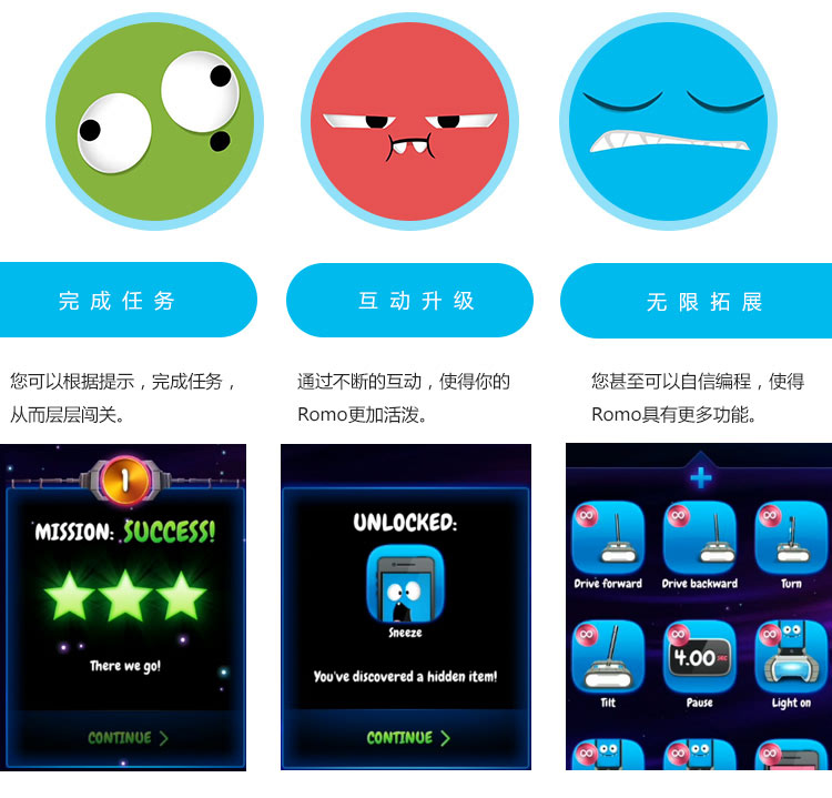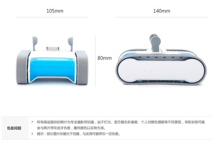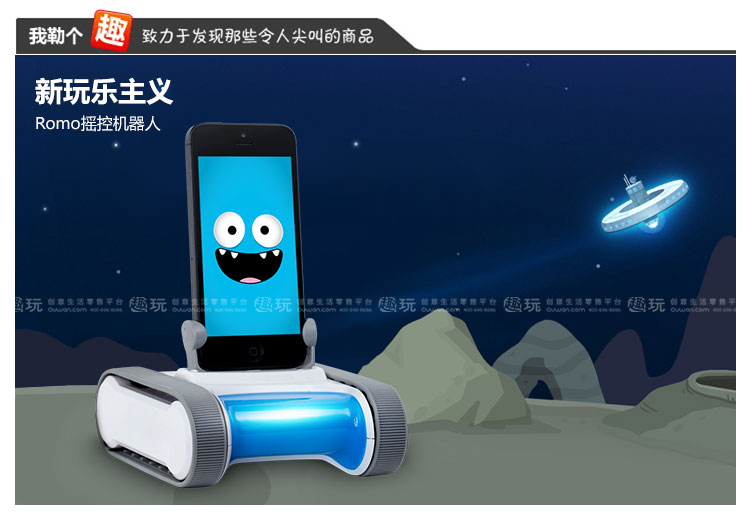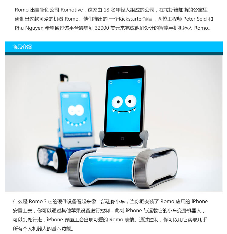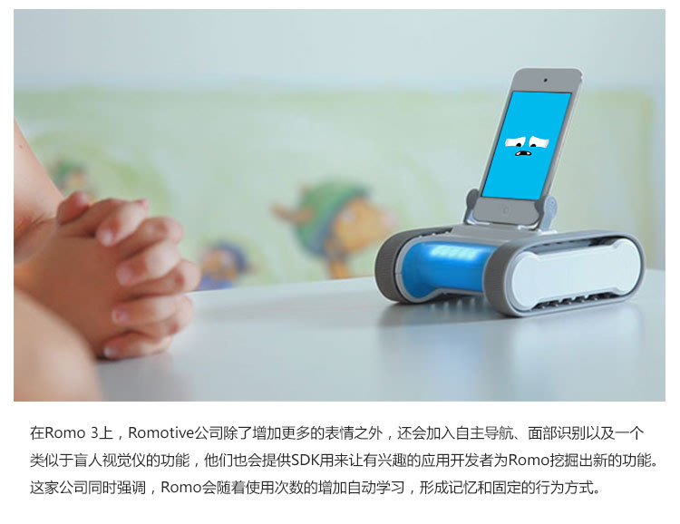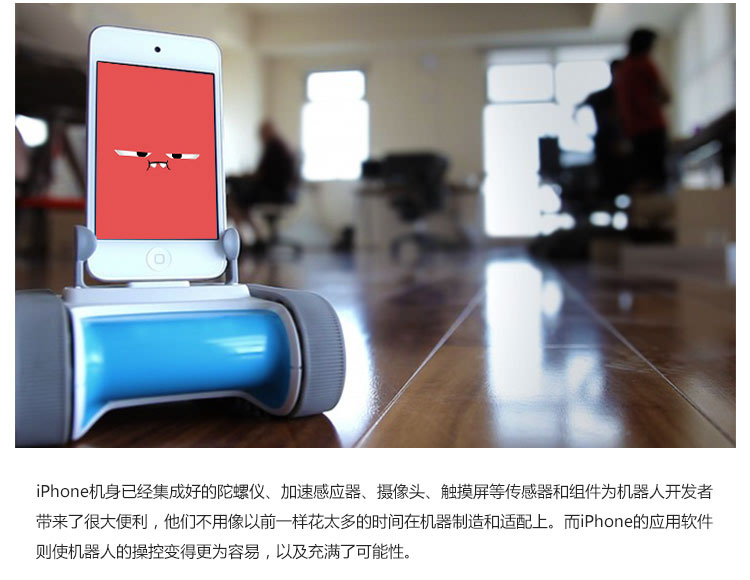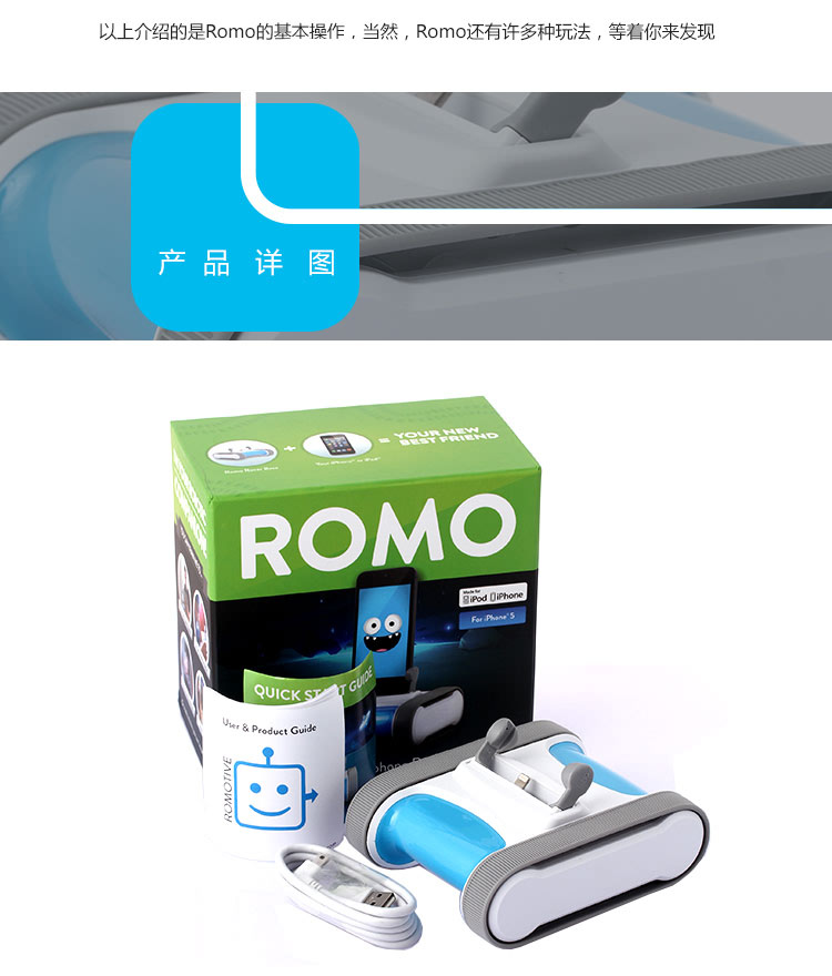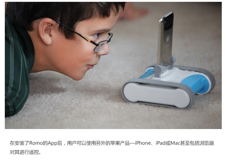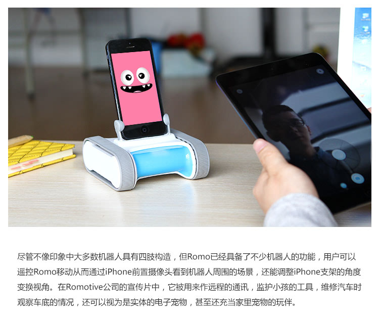 演示产品,请勿购买!! 演示产品,请勿购买!! Romo包含一个可以移动的底座和配套的应用软件,用户只要把iPhone手机插在底座上,就能用安装了配套应用的iPho