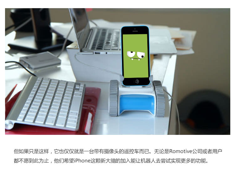 Romo包含一个可以移动的底座和配套的应用软件,用户只要把iPhone手机插在底座上,就能用安装了配套应用的iPhone、iPad或Mac电脑对其进行遥控