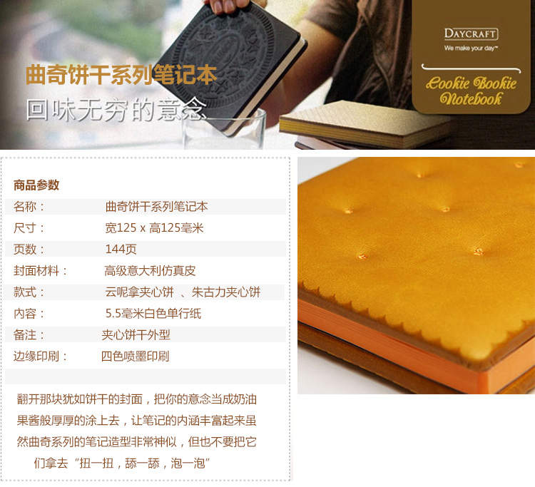 翻开那块犹如饼干的封面,把你的意念当成奶油、果酱般厚厚的涂上去,让笔记的内涵丰富起来。虽然曲奇系列的笔记造型非常神似,但也不要把它们拿去“扭一扭,舔一舔,泡一泡” 。